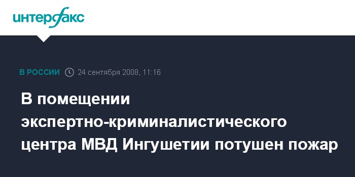 Москва. 24 сентября. INTERFAX.RU - Ликвидировано возгорание здания экспертно-криминалистического центра МВД Ингушетии в Назрани. "Пожар произошел примерно в 10:30 мск в отдельно стоящем от здания министерства здании экспертно-криминалистического центра. Предположительно, причиной пожара мог стать взрыв бытового газа", - сообщили агентству "Интерфакс-Юг" в среду в штабе временной группировки войск.
