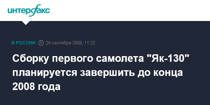 Москва. 24 сентября. INTERFAX.RU - Сборку первого учебно-боевого самолета (УБС) "Як-130" для российских Военно-воздушных сил на Нижегородском авиастроительном заводе "Сокол" планируется закончить до конца текущего года, сообщили "Интерфаксу" в оборонно-промышленном комплексе.