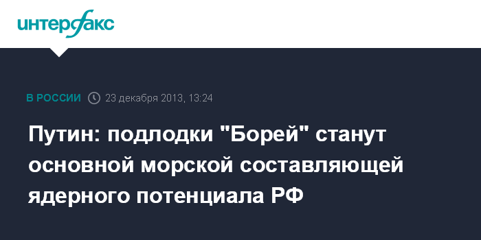 Москва. 23 декабря. INTERFAX.RU - Президент РФ Владимир Путин заявил, что техника класса "Борей", подобная АПЛ "Александр Невский", должна быть основой морской составляющей ядерной триады России.