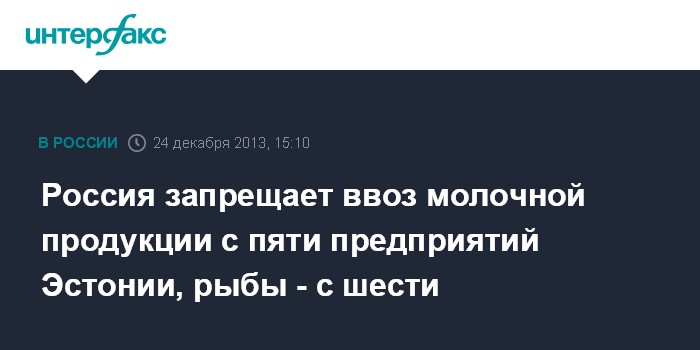 Москва. 24 декабря. INTERFAX.RU - Россия в ближайшие недели планирует ввести ограничения на поставку молочной продукции с пяти предприятий Эстонии, рыбы и рыбной продукции - с шести.