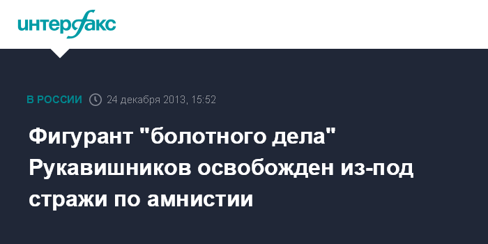 Москва. 24 декабря. INTERFAX.RU - Фигурант "болотного дела" Дмитрий Рукавишников, обвиняемый ранее в участии в массовых беспорядках, освобожден из-под стражи в связи с амнистией, сообщило во вторник пресс-бюро ФСИН России.