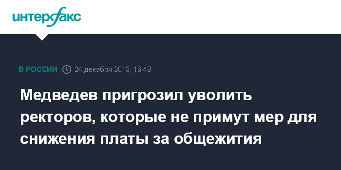Москва. 24 декабря. INTERFAX.RU - Премьер-министр РФ Дмитрий Медведев заявил, что ректоры в государственных высших учебных заведениях, которые не примут мер для снижения платы за студенческие общежития, могут поплатиться своими должностями.