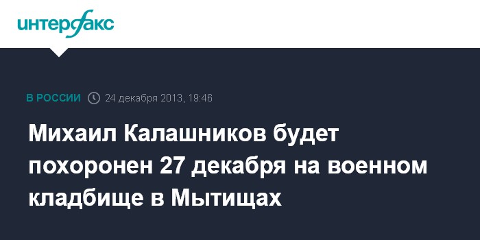 "По решению родственников М. Т. Калашникова похороны выдающегося конструктора пройдут 27 декабря 2013 года в городе Москва на Федеральном военно-мемориальном комплексе", - говорится в сообщении.