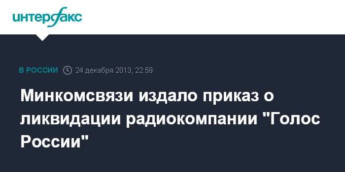 Москва. 24 декабря. INTERFAX.RU - Минкомсвязи РФ во вторник обнародовало приказ о ликвидации федерального государственного бюджетного учреждения "Российская государственная радиовещательная компания "Голос России". Документ издан в соответствии с указом президента РФ "О некоторых мерах по повышению эффективности деятельности государственных средств массовой информации"