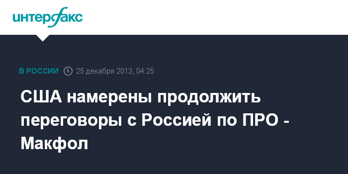 "Мы считаем стоящие перед нами угрозы схожими для наших стран. У нас нет ни намерения, ни возможностей строить систему ПРО против России. Это наивно и физически невозможно. Пока мы не достигли значимых результатов в переговорах с Россией, но планируем продолжить работу в этом направлении", - сказал М.Макфол.
