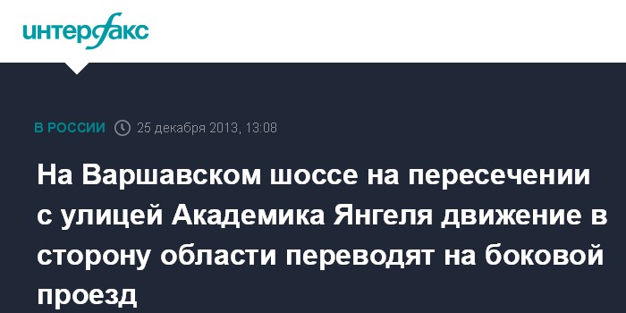 Москва. 25 декабря. INTERFAX.RU - В связи со строительством автомобильной эстакады в районе пересечения Варшавского шоссе с ул.Академика Янгеля в ночь с 25 на 26 декабря будет переведено движение автотранспорта в сторону области на боковой проезд с сохранением полос движения на весь период строительства.