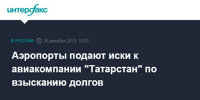 Казань. 25 декабря. INTERFAX.RU - Российские аэропорты заявляют в арбитражных судах требования о взыскании задолженности с ОАО "Авиакомпания "Татарстан", которая с 31 декабря лишится сертификата эксплуатанта.