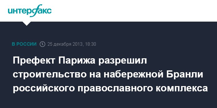 "Посольство России во Франции получило извещение, что префект Парижа и столичного региона Иль-де-Франс 24 декабря подписал разрешение на строительство на набережной Бранли в Париже российского православного духовно-культурного комплекса", - сказал Хреков в среду "Интерфаксу".