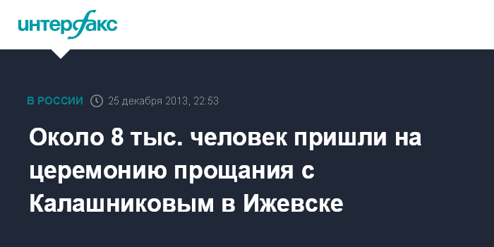 Москва. 25 декабря. INTERFAX.RU - Первый день прощания с умершим в понедельник конструктором-оружейником Михаилом Калашниковым завершился в Ижевске, церемония продолжится в четверг.