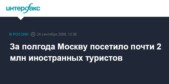 Москва. 24 сентября. INTERFAX.RU - За первое полугодие 2008 года Москву посетило 1 млн 941 тыс. зарубежных гостей, что на 18% больше по сравнению с аналогичным периодом прошлого года, сообщил глава столичного комитета по туризму Григорий Антюфеев на пресс-конференции в среду.