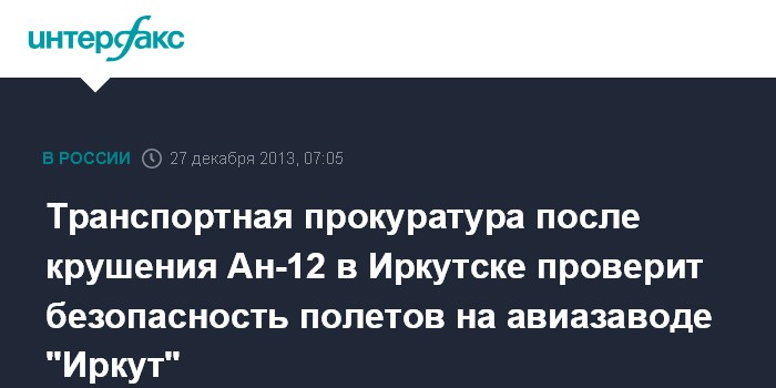Иркутск. 27 декабря. ИНТЕРФАКС-СИБИРЬ - Восточно-Сибирская транспортная прокуратура организовала проверку по факту крушения под Иркутском грузового самолета Ан-12, принадлежащего иркутскому авиазаводу ОАО "Научно-производственная корпорация "Иркут", которое унесло жизни девяти человек.