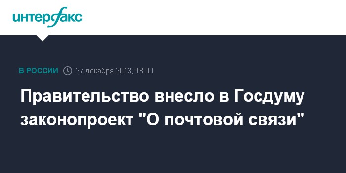 Москва. 27 декабря. INTERFAX.RU - Правительство России внесло в Госдуму проект закона "О почтовой связи", говорится в материалах нижней палаты парламента.