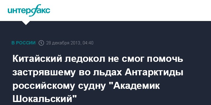Москва. 28 декабря. INTERFAX.RU - Российское судно "Академик Шокальский" продолжает дрейфовать во льдах Антарктиды в ожидании подхода ледоколов.
