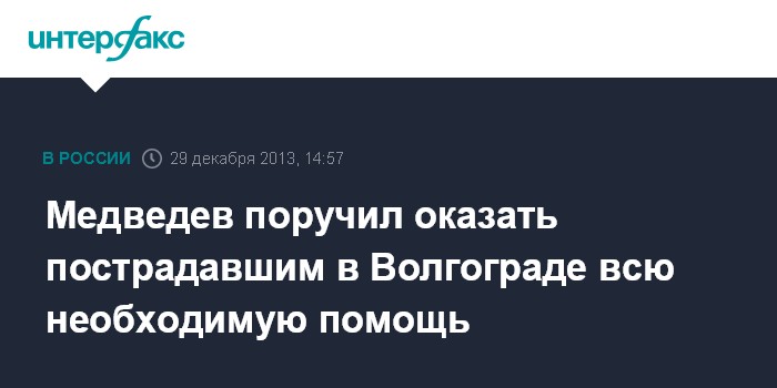 Москва. 29 декабря. INTERFAX.RU - Премьер-министр РФ Дмитрий Медведев поручил руководству МЧС и Минздрава оказать всю необходимую помощь пострадавшим от теракта в Волгоградской области, в том числе обеспечить при необходимости доставку пострадавших в московские больницы, сообщили в пресс-службе правительства.