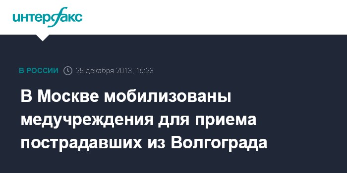 Москва. 29 декабря. INTERFAX.RU - Медучреждения Москвы, в первую очередь ожоговые центры, приведены в повышенную готовность в связи с терактом в Волгограде, сообщил "Интерфаксу" вице-мэр столицы Леонид Печатников. "Мы мобилизовали все ожоговые центры города, зарезервировали дополнительные койки для того, чтобы в случае необходимости принять пострадавших в результате взрыва в Волгограде", - подчеркнул Л.Печатников.