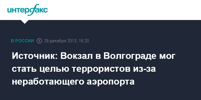 Москва. 29 декабря. INTERFAX.RU - Террористы могли выбрать своей целью вокзал в Волгограде с учетом скопления в нем людей не только в связи с грядущими праздниками, но и по причине неработающего несколько дней из-за непогоды аэропорта города, сообщил "Интерфаксу" в воскресенье источник в силовых структурах региона. "Аэропорт Волгограда уже несколько дней не работает из-за неблагоприятных погодных условий. По этой причине на вокзале собрались сотни людей, уезжающие на новогодние праздники из города", - сказал собеседник агентства.