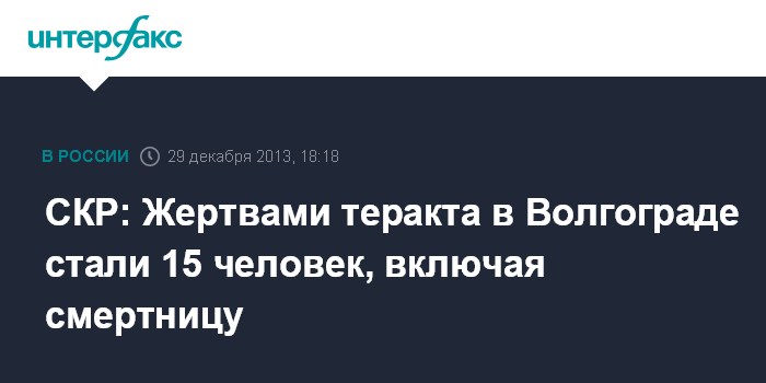 Москва. 29 декабря. INTERFAX.RU - Теракт в Волгограде, по уточненным данным, унес жизни 15 человек, сообщил "Интерфаксу" официальный представитель СКР Владимир Маркин. "По уточненным данным, в результате взрыва на железнодорожном вокзале в Волгограде, погибли 15 человек", - сказал В.Маркин.