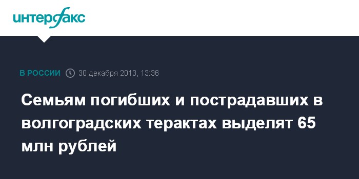 Проектом распоряжения предусматривается выделить правительству Волгоградской области из резервного фонда правительства РФ до 65 млн рублей, из них 62 млн рублей выделяется для выплаты единовременных пособий семьям погибших - по одному миллиону рублей на каждого умершего. По 400 тыс. рублей выделяется на каждого человека, получившего в результате теракта тяжкий вред здоровью, и по 200 тыс. - получившим легкий вред.
