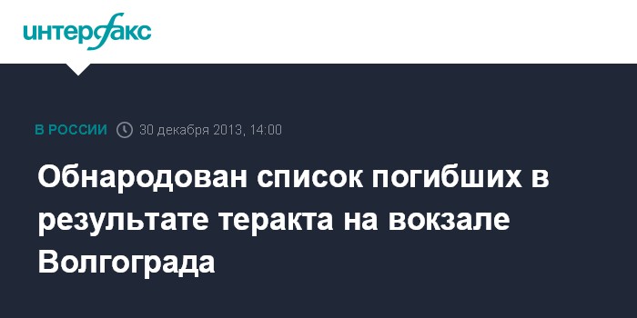Москва. 30 декабря. INTERFAX.RU - Пресс-служба губернатора Волгоградской области опубликовала список всех 17 погибших в теракте на железнодорожном вокзале "Волгоград-1".