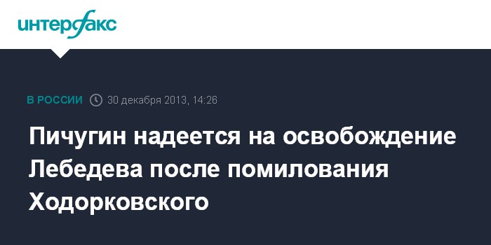 Москва. 30 декабря. INTERFAX.RU - Бывший начальник отдела безопасности НК ЮКОС Алексей Пичугин, отбывающий пожизненный срок за организацию заказных убийств, приветствует помилование одного из экс-руководителей компании Михаила Ходорковского и надеется, что в 2014 году на свободу выйдет Платон Лебедев.