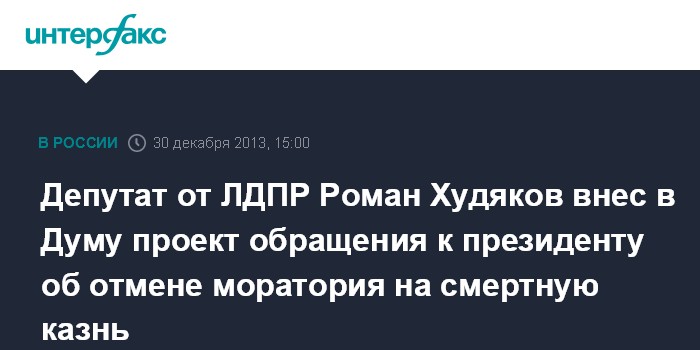 Москва. 30 декабря. INTERFAX.RU - Депутат Госдумы, член фракции ЛДПР Роман Худяков рассчитывает, что представители всех четырех парламентских фракций поддержат подготовленный им проект обращения нижней палаты парламента к президенту РФ об отмене моратория на применение смертной казни в России.