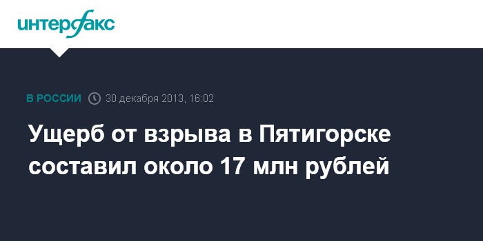 Москва. 30 декабря. INTERFAX.RU - Городские комиссии, организованные оперативным штабом по ликвидации последствий взрывов в Пятигорске, объявили сумму предварительного ущерба - она составила около 17 млн рублей.