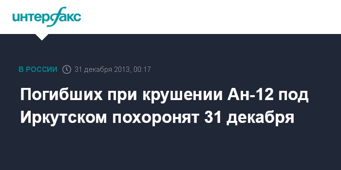 Москва. 31 декабря. INTERFAX.RU - Похороны девяти погибших при крушении грузового самолета Ан-12 под Иркутском назначены на 31 декабря, сообщили агентству "Интерфакс" на иркутском авиазаводе ОАО "Научно-производственная корпорация "Иркут".