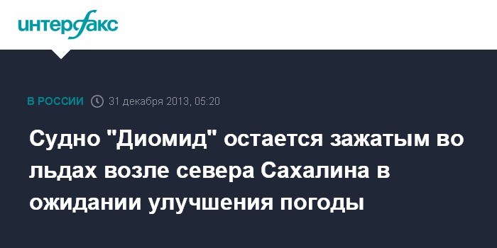 Москва. 31 декабря. INTERFAX.RU - Транспортное судно "Диомид", застрявшее в понедельник утром во льдах в Сахалинском заливе (северо-западное побережье Сахалина - ИФ), все еще остается в том же положении, ожидая улучшения погодных условий, сообщили во вторник агентству "Интерфакс-Дальний Восток" в морском спасательном подцентре (МСПЦ) "Южно-Сахалинск".