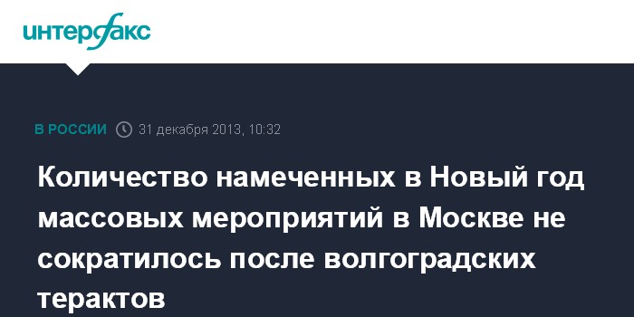 Москва. 31 декабря. INTERFAX.RU - Власти Москвы в связи с терактами в Волгограде не стали сокращать количество массовых новогодних мероприятий.
