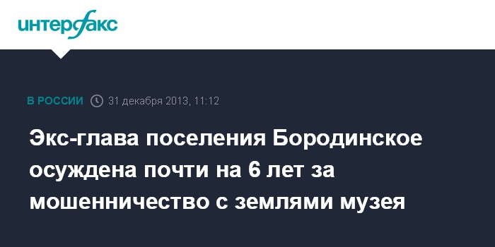 Москва. 31 декабря. INTERFAX.RU - Бывшая глава сельского поселения Бородинское Майя Склюева осуждена на 5 лет и 9 месяцев лишения свободы за мошенничество с землями Бородинского музея, сообщили "Интерфаксу" в Генпрокуратуре РФ.