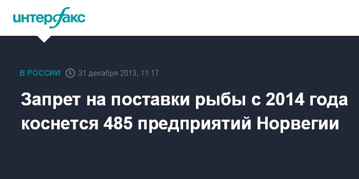 Москва. 31 декабря. INTERFAX.RU - Запрет на поставки рыбы из Норвегии с 1 января 2014 г. коснется 485 рыбных предприятий этой страны, сообщили "Интерфаксу" в Россельхознадзоре.