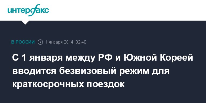 Москва. 1 января. ИНТЕРФАКС - Россия и Южная Корея с 1 января переходят на безвизовый режим для краткосрочных поездок граждан двух стран.