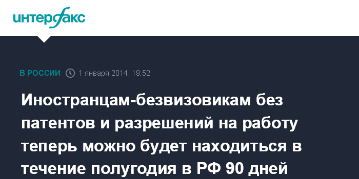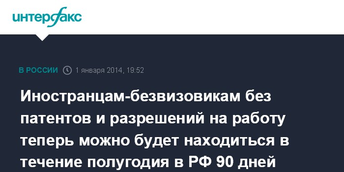 Москва. 1 января. ИНТЕРФАКС - С 1 января 2014 года вступил в силу закон, который ограничивает 90 днями в течение полугодия возможность пребывания в России иностранцев из безвизовых стран.