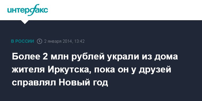Более 2 млн рублей украли из дома жителя Иркутска, пока он у друзей справлял Новый год