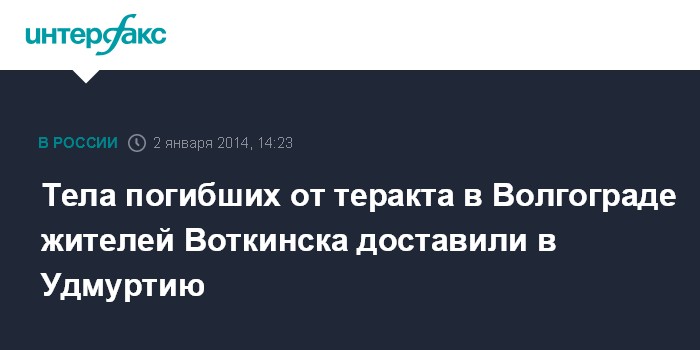 Москва. 2 января. INTERFAX.RU - В Удмуртию привезли тела двоих жителей республики, погибших в Волгограде в результате теракта на железнодорожном вокзале, сообщили агентству "Интерфакс-Поволжье" в пресс-службе регионального ГУ МЧС России в четверг. Собеседник агентства отметил, что тела погибших жителей Воткинска привезли в сопровождении родственников и сотрудников ГУ МЧС России по Удмуртии.
