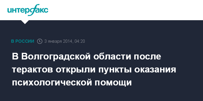 Москва. 3 января. INTERFAX.RU - Правительство Волгоградской области открыло круглосуточные пункты оказания психологической поддержки пострадавшим в двух терактах, сообщили в пятницу агентству "Интерфакс-Юг" в пресс-службе губернатора и правительства Волгоградской области.