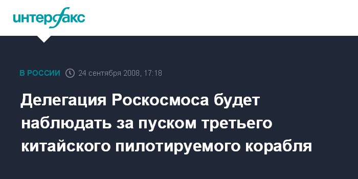 Москва. 24 сентября. INTERFAX.RU - Официальная делегация Роскосмоса вылетела в Китай, где примет участие в запуске третьего китайского пилотируемого космического корабля.