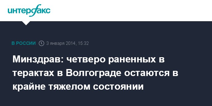 Москва. 3 января. INTERFAX.RU - Четыре человека, которых госпитализировали после терактов в Волгограде, остаются в крайне тяжелом состоянии, сообщили "Интерфаксу" в пятницу в пресс-службе Минздрава.