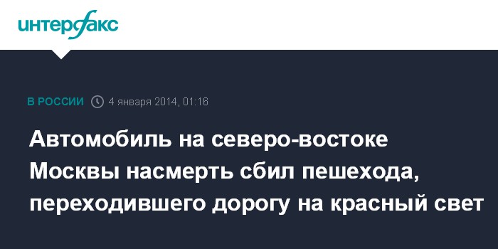 Москва. 4 января. ИНТЕРФАКС - Автомобиль "Жигули" вечером в пятницу сбил пешехода, переходившего дорогу на красный сигнал светофора на северо-востоке Москвы, сообщили "Интерфаксу" в пресс-службе столичного управления ГИБДД.