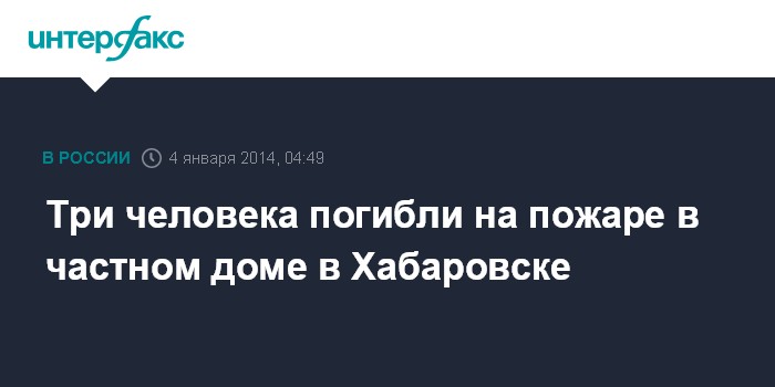Якутск. 4 января. ИНТЕРФАКС - ДАЛЬНИЙ ВОСТОК - Три человека погибли в результате пожара в частном доме в Хабаровске, сообщает в субботу пресс-служба ДВРЦ МЧС России.