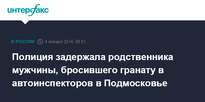 Москва. 4 января. ИНТЕРФАКС - Задержан родственник мужчины, бросившего гранату в сотрудников госавтоинспекции в подмосковном Железнодорожном, сообщил "Интерфаксу" источник в правоохранительных органах.