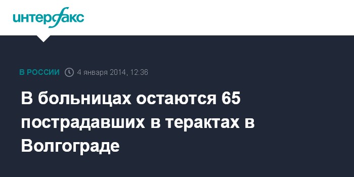 Москва. 4 января. INTERFAX.RU - На стационарном лечении в Волгограде и Москве находятся 65 человек, пострадавших в результате терактов в Волгограде, говорится в сообщении Минздрава РФ, размещенном в субботу на сайте ведомства. "На стационарном лечении в медицинских организациях Волгограда находятся 45 человек (из них в крайне тяжелом состоянии - 2 чел., в тяжелом состоянии - 2 чел., в состоянии средней степени тяжести - 6 чел., в удовлетворительном состоянии - 35 чел.)", - говорится в сообщении.