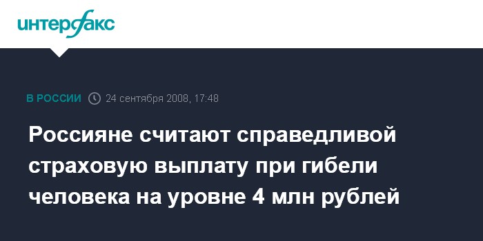Москва. 24 сентября. INTERFAX.RU - Оценка справедливого размера страховой выплаты в случае гибели человека на транспорте или на производстве в России за год выросла более чем на 1 млн рублей - до 4 млн рублей. Такой вывод содержится в исследовании по результатам всероссийского опроса, проведенного Центром стратегических исследований "Росгосстраха" по заказу компании "КапиталЪ Страхование Жизни" в августе 2008 года.