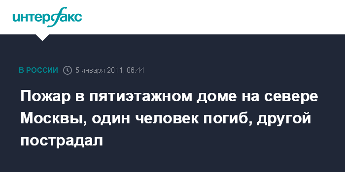 Москва. 5 января. ИНТЕРФАКС - Один человек погиб и один пострадал в результате пожара в пятиэтажном жилом доме на севере Москвы, сообщили "Интерфаксу" в пресс-службе столичного управления МЧС.