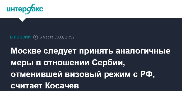 "Я приветствую инициативу сербских властей и считаю, что с учетом особых отношений наших стран это решение рано или поздно должно стать взаимным", - сказал К.Косачев "Интерфаксу" в четверг.