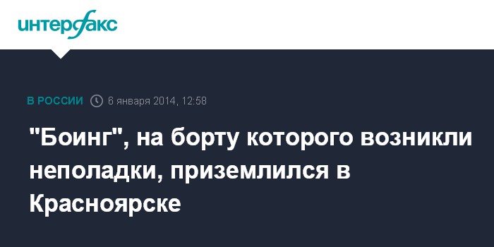 Москва. 6 января. INTERFAX.RU - Самолет "Боинг-757" совершил штатную посадку в красноярском аэропорту "Емельяново", - сообщила агентству "Интерфакс-Сибирь" пресс-секретарь аэропорта Юлия Аржанова. "Самолет "Боинг-757" совершил благополучную посадку в 16:35 по местному времени в аэропорту "Емельяново", никто не пострадал", - сказала Ю.Аржанова.