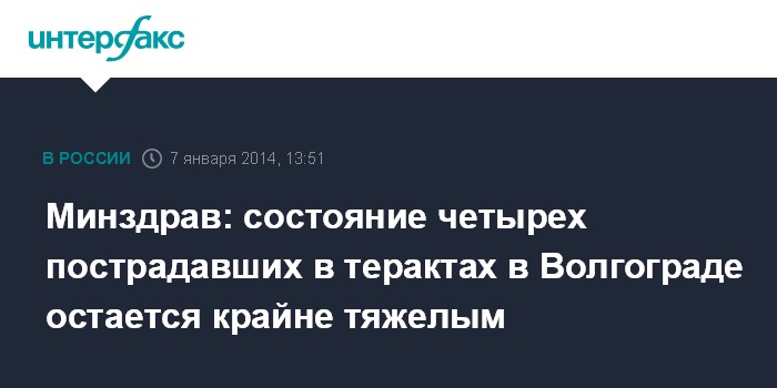 Москва. 7 января. INTERFAX.RU - Четверо пострадавших в результате терактов в Волгограде находятся в крайне тяжелом состоянии, сообщила глава Минздрава России Вероника Скворцова.