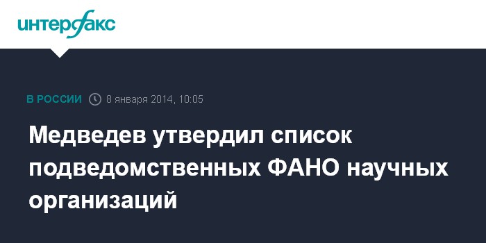 Москва. 8 января. INTERFAX.RU - Председатель правительства России Дмитрий Медведев утвердил перечень организаций, подведомственных Федеральному агентству научных организаций (ФАНО), сообщила в среду пресс-служба правительства.