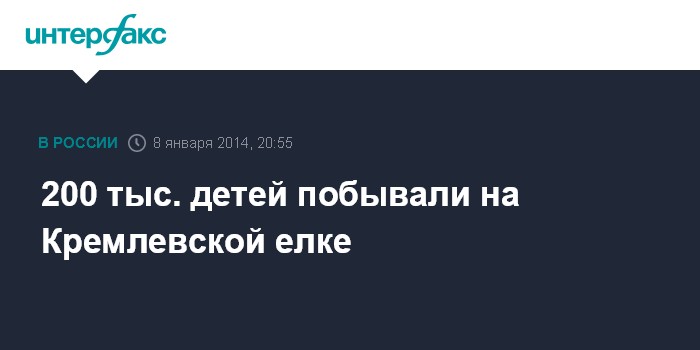 "За две недели на новогодних детских праздниках побывали 200 тысяч детей. В рамках праздничных детских мероприятий 26 декабря в Кремле прошла общероссийская новогодняя елка, 8 января - патриаршая рождественская елка для воспитанников воскресных школ, детдомов, приютов и детей из многодетных семей", - сказал В.Хреков "Интерфаксу" в среду.