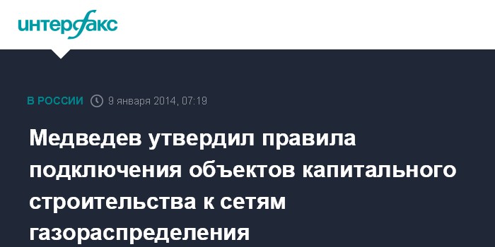 Москва. 9 января. INTERFAX.RU - Председатель правительства РФ Дмитрий Медведев утвердил Правила подключения объектов капитального строительства к сетям газораспределения, сообщила пресс-служба кабинета министров.